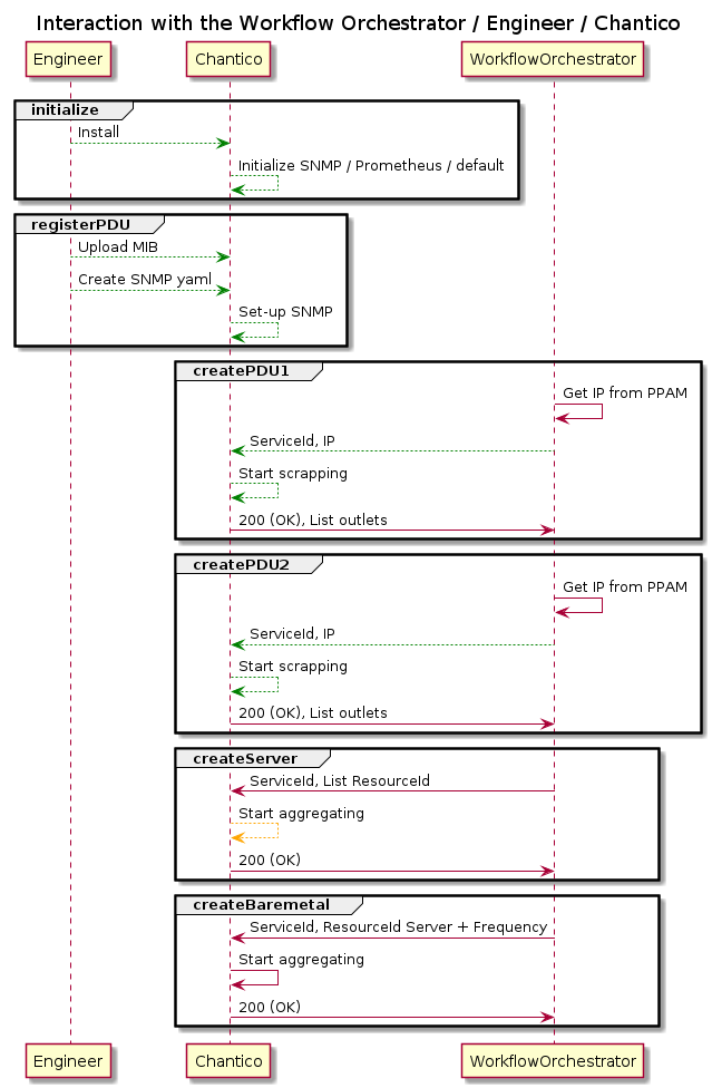 The sequence diagram are the interactions between chantico, the workflow orchestrator and the engineer.